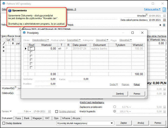 Rezultatem odebrania uprawnień będzie blokada możliwości podpięcia przedpłaty na dokumencie potwierdzona odpowiednim komunikatem.