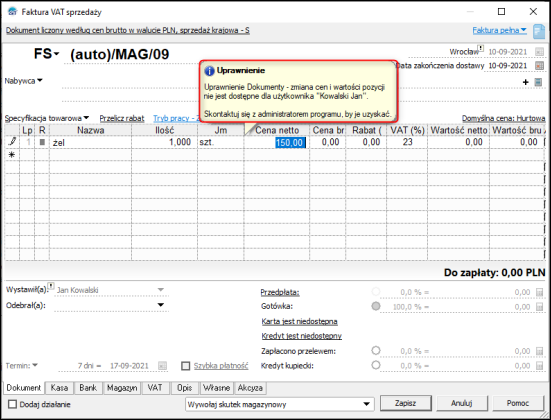 Rezultatem odebrania uprawnień będzie blokada możliwości zmiany cen i wartości pozycji na dokumencie potwierdzona odpowiednim komunikatem.