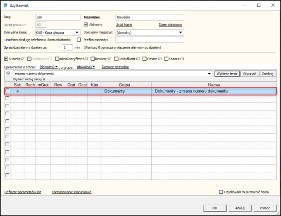 3. Na liście uprawnień odznaczyć pozycję o nazwie Dokumenty – zmiana numeru dokumentu. Aby zapisać zmiany, należy wybrać OK