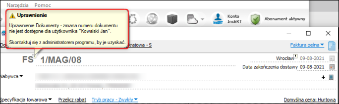 Rezultatem odebrania uprawnień będzie blokada możliwości zmiany numeru dokumentu potwierdzona odpowiednim komunikatem.