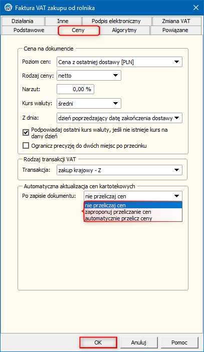 2. W oknie, które się wyświetli przejść na zakładkę Ceny i w sekcji Automatyczna aktualizacja cen kartotekowych wybrać jedną z trzech opcji: