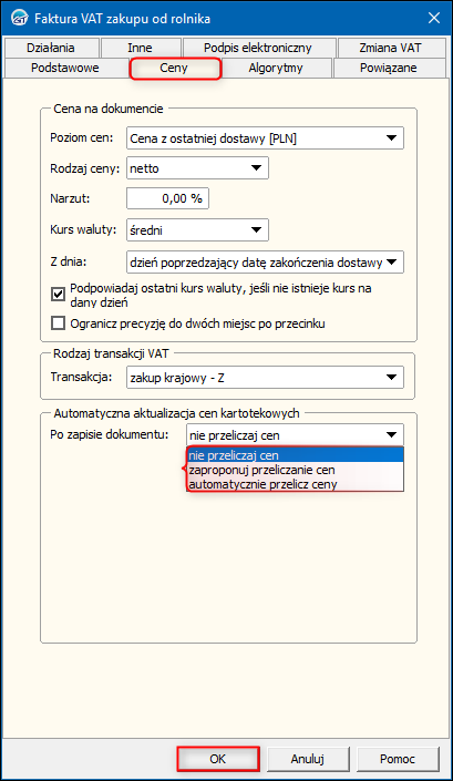 - automatycznie przelicz ceny – opcja ta spowoduje, że przeliczanie cen nastąpi w pełni automatycznie. Cena kartotekowa zostanie zastąpiona ceną z dokumentu