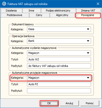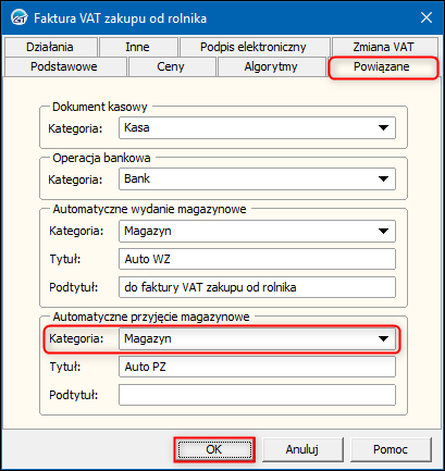 2. W oknie, które się wyświetli przejść na zakładkę Powiązane i wybrać domyślną Kategorię w sekcji Automatyczne przyjęcie magazynowe. Zmiany zapisać przyciskiem OK.