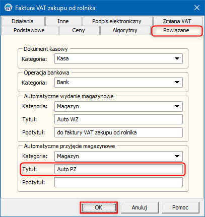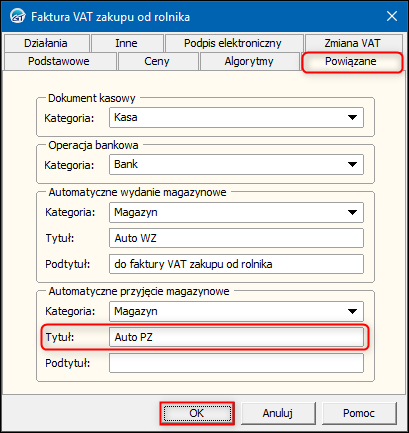 2. W oknie, które się wyświetli przejść na zakładkę Powiązane i wpisać domyślny Tytuł w sekcji Automatyczne przyjęcie magazynowe. Zmiany zapisać przyciskiem OK.