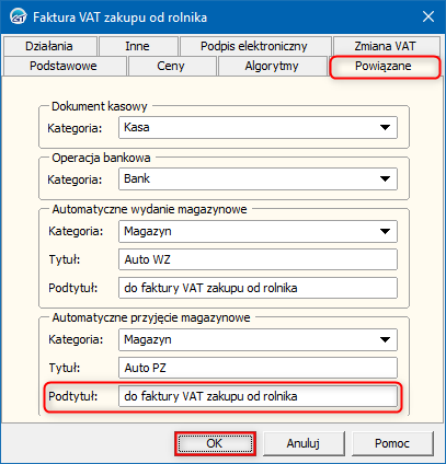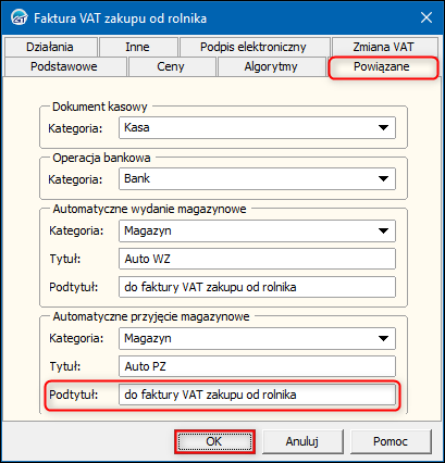 2. W oknie, które się wyświetli przejść na zakładkę Powiązane i wpisać domyślny Podtytuł w sekcji Automatyczne przyjęcie magazynowe. Zmiany zapisać przyciskiem OK.
