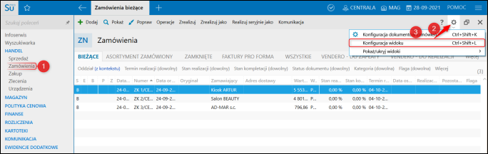 1. Przejść do modułu Zamówienia, następnie kliknąć zębatkę znajdującą się w prawym górnym rogu i wybrać Konfiguracja widoku.