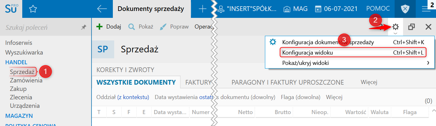 1. Przejść na zakładkę Sprzedaż, rozwinąć menu koła zębatego i wybrać Konfiguracja widoku.