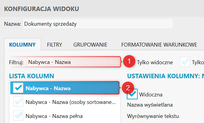 2. Na zakładce Kolumny w polu Filtruj wpisać Nabywca – Nazwa, zaznaczyć wyszukaną kolumnę na liście i zatwierdzić zmiany przyciskiem OK.