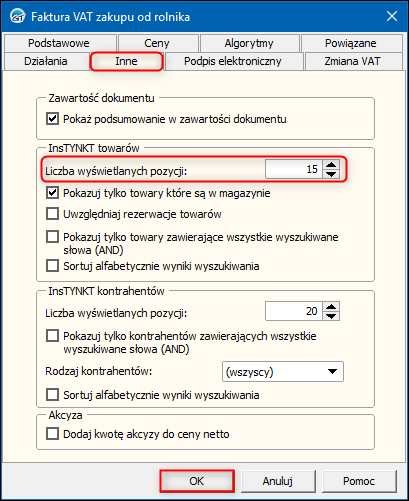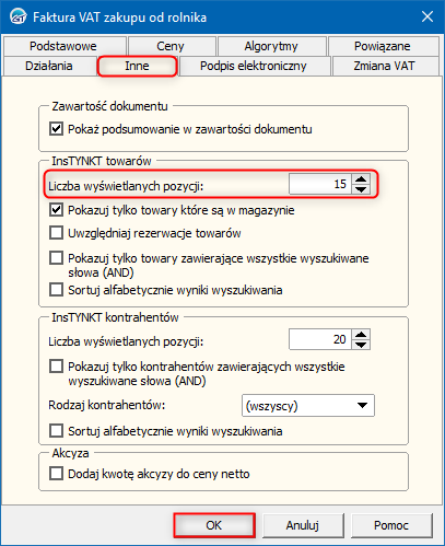 2. W oknie Faktura VAT zakupu od rolnika przejść na zakładkę Inne i wybrać Liczbę wyświetlanych pozycji w sekcji InsTYNKT towarów. Zmiany zapisać przyciskiem OK.