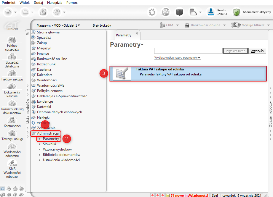 1. Z listy modułów wybrać Administracja – Parametry, a z listy parametrów Faktura VAT zakupu od rolnika.