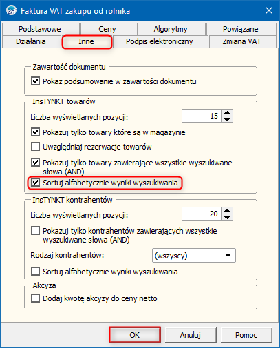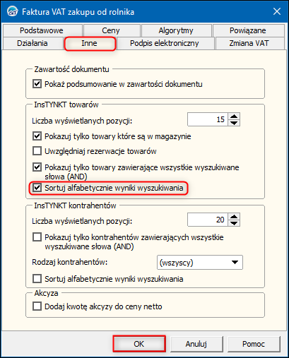 2. W oknie Faktura VAT zakupu od rolnika przejść na zakładkę Inne i zaznaczyć opcję Sortuj alfabetycznie wyniki wyszukiwania w sekcji InsTYNKT towarów. Zmiany zapisać przyciskiem OK.