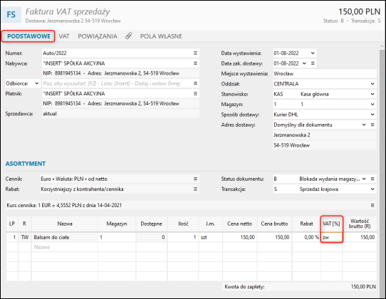 Mając pozycję na w tabeli asortymentu ze stawką zw (zakładka Podstawowe), można zdefiniować przyczynę zwolnienia z VAT.