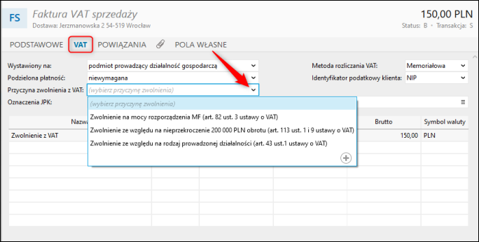 Subiekt nexo – Jak określić przyczynę zwolnienia z VAT na fakturze sprzedaży?