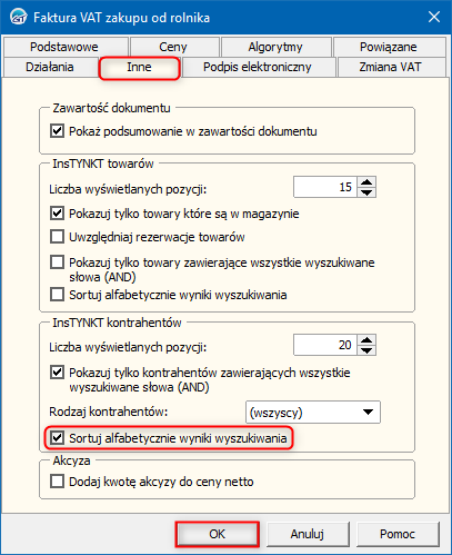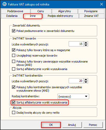 2. W oknie Faktura VAT zakupu od rolnika przejść na zakładkę Inne i zaznaczyć opcję Sortuj alfabetycznie wyniki wyszukiwania w sekcji InsTYNKT kontrahentów. Zmiany zapisać przyciskiem OK.