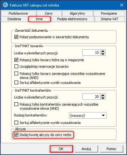 2. W oknie Faktura VAT zakupu od rolnika przejść na zakładkę Inne i zaznaczyć opcję Dodaj kwotę akcyzy do ceny netto. Zmiany zapisać przyciskiem OK.