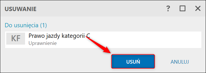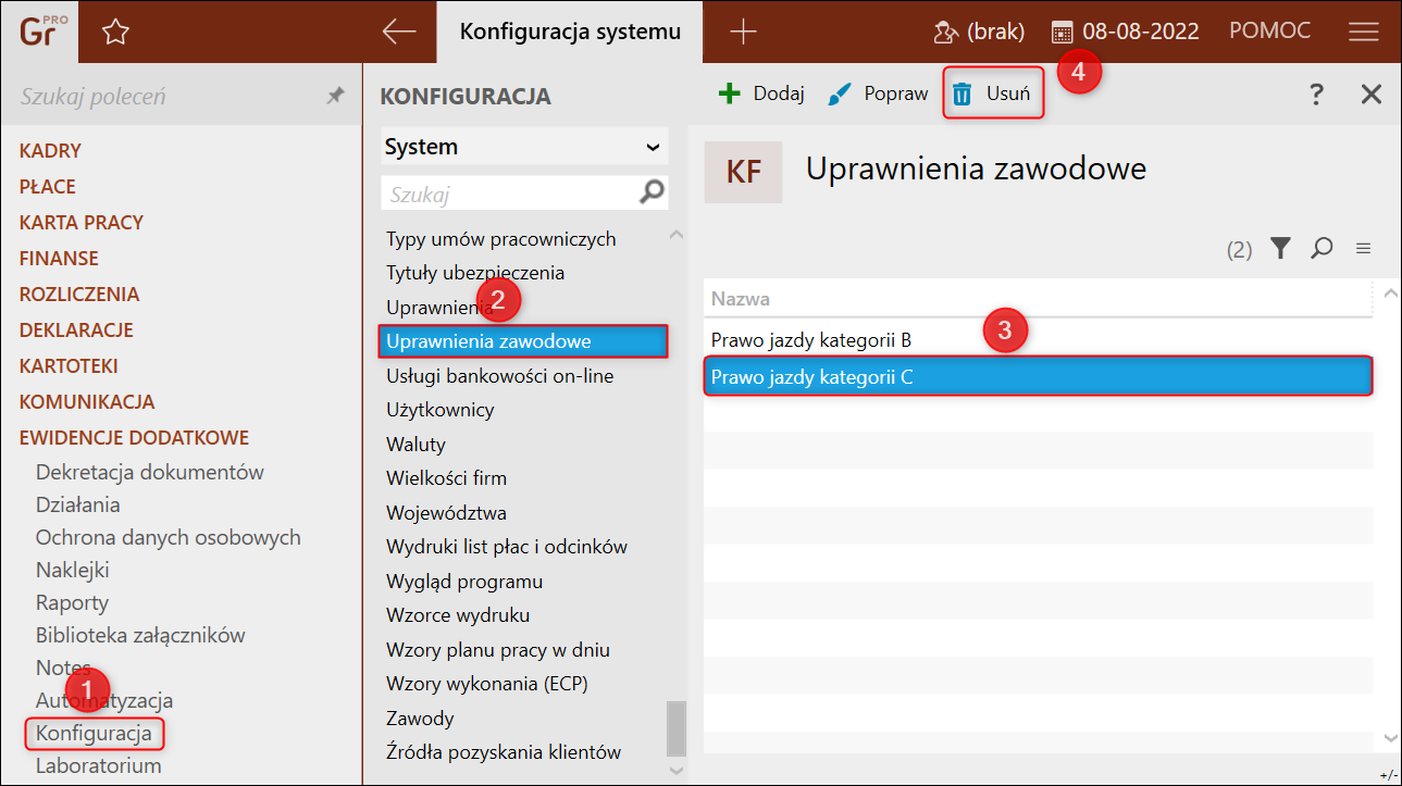 1. Przejść do modułu Konfiguracja – Uprawnienia zawodowe, zaznaczyć wybrane uprawnienie i kliknąć Usuń.