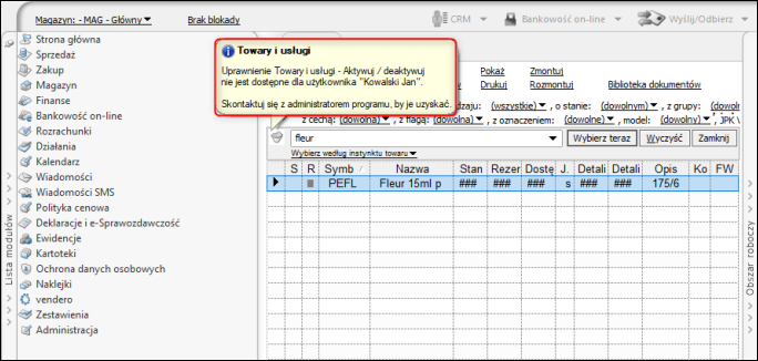 Rezultatem odebrania uprawnień będzie blokada możliwości aktywacji/dezaktywacji kartoteki asortymentu potwierdzona odpowiednim komunikatem.