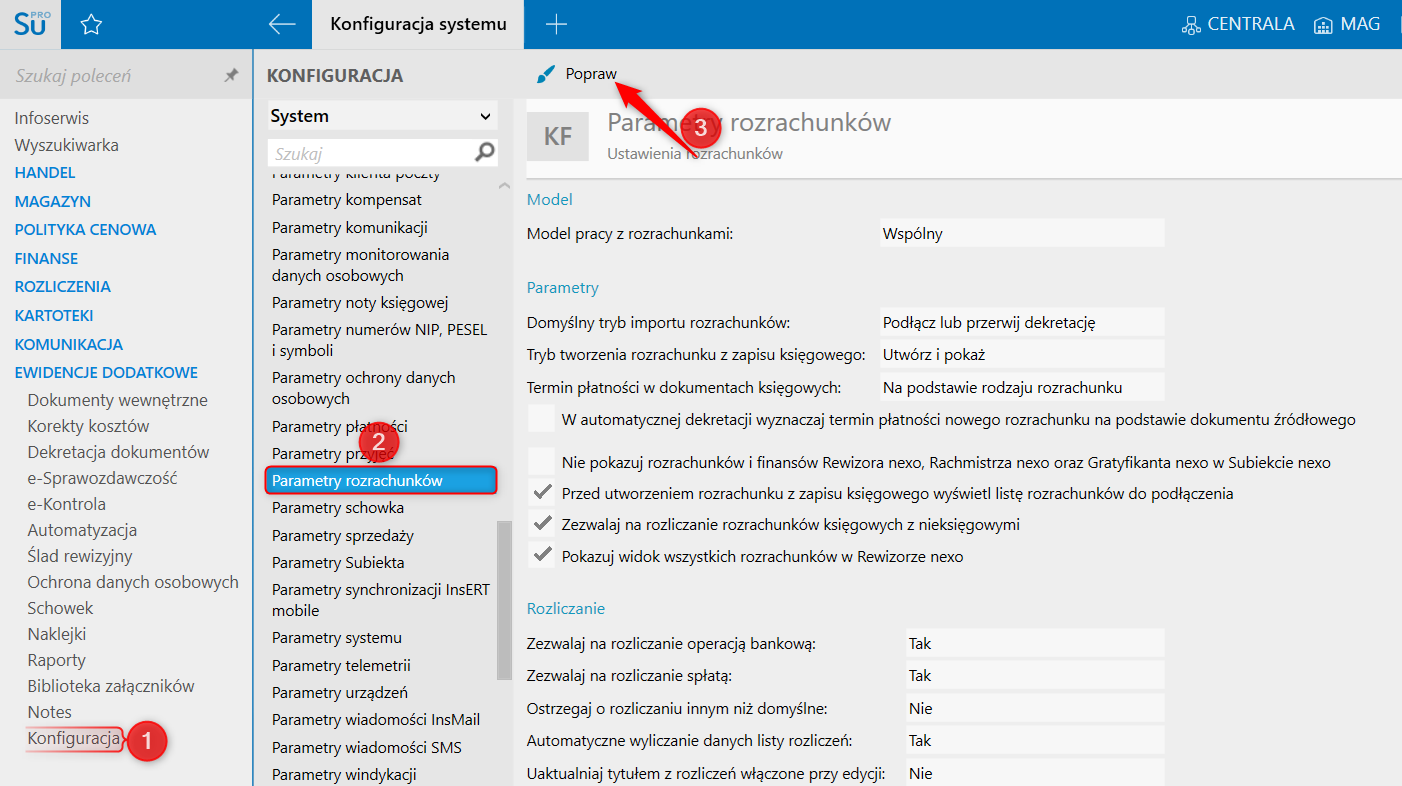 1. Przejść do modułu Konfiguracja – Parametry rozrachunków, następnie kliknąć Popraw.