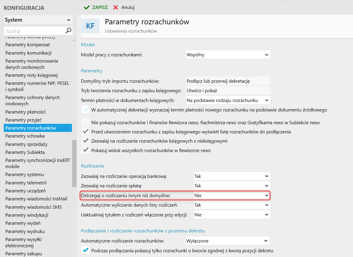 2. W sekcji Rozliczanie parametr Ostrzegaj o rozliczaniu innym niż domyślne ustawić na Nie.