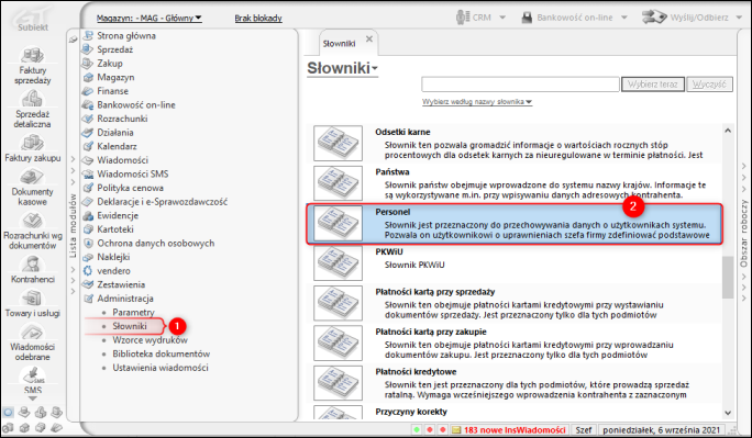 1. Zalogować się na użytkownika Szef, a następnie z listy modułów wybrać Administracja – Słowniki, a następnie z listy słowników wybrać Personel.​​​​​​​​