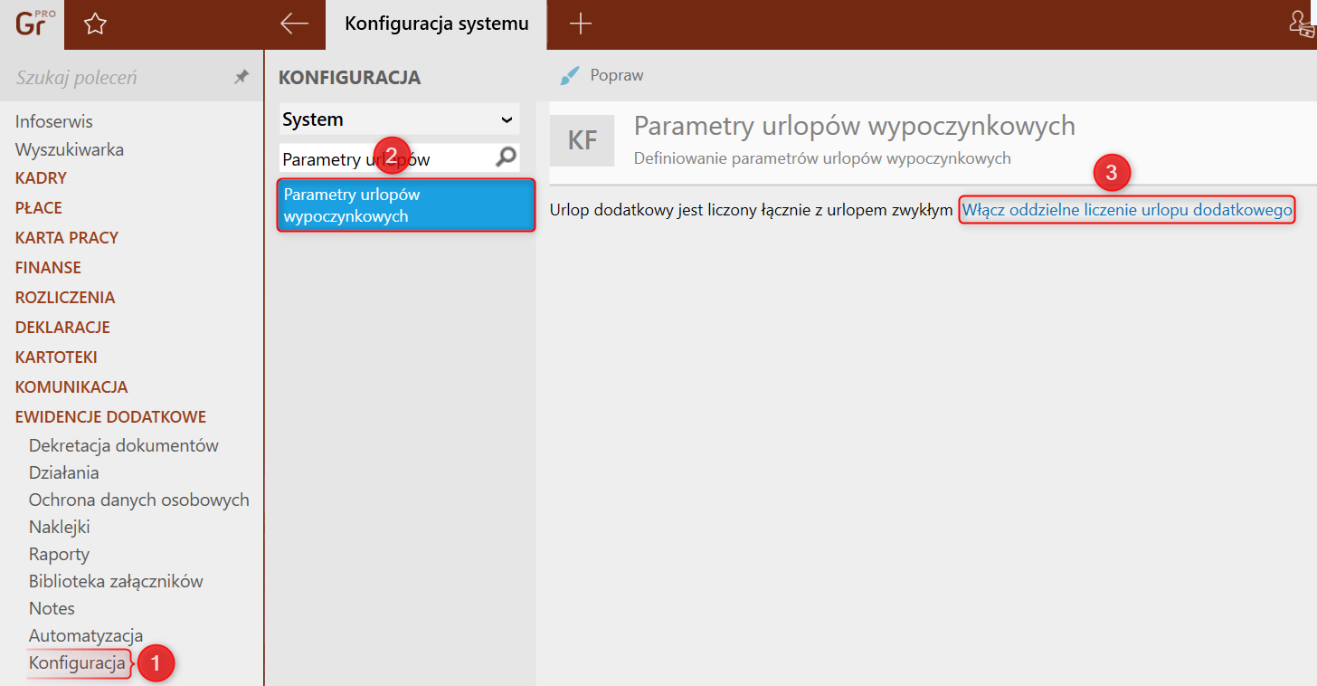 Aby włączyć oddzielne liczenie urlopu dodatkowego, należy: