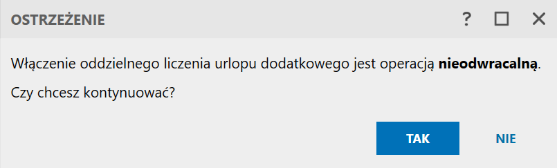 W programie Gratyfikant nexo urlop dodatkowy jest liczony łącznie z urlopem zwykłym. Aby zmienić to ustawienie, należy włączyć opcję oddzielnego liczenia urlopu, pamiętając przy tym, że jest to operacja nieodwracalna.