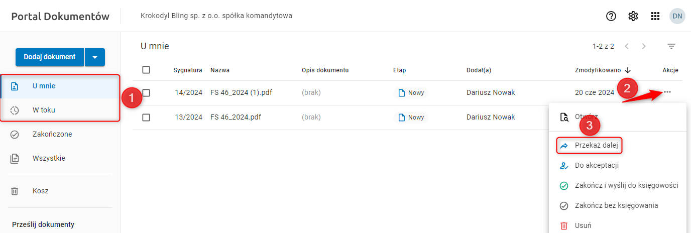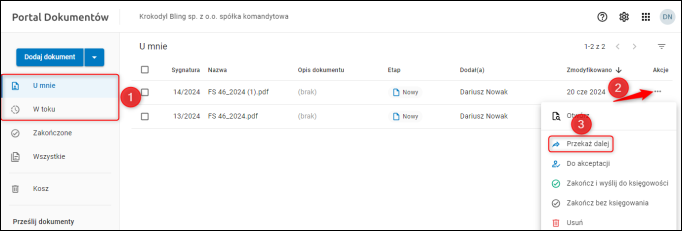 1. Przejść do modułu U mnie/W toku, kliknąć menu przy dokumencie i wybrać Przekaż dalej.