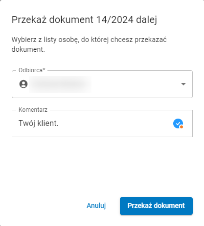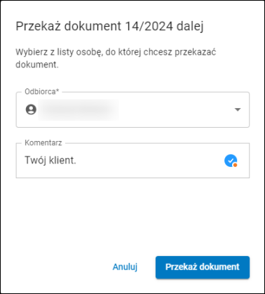 2. Z listy rozwijalnej wybrać Odbiorcę, uzupełnić Komentarz i zatwierdzić przyciskiem Przekaż dokument.