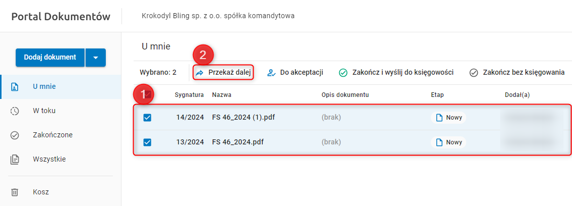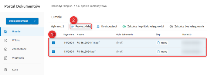 Istnieje możliwość przekazania dokumentów innemu użytkownikowi zbiorczo. Aby to zrobić, należy zaznaczyć kilka dokumentów i kliknąć Przekaż dalej.