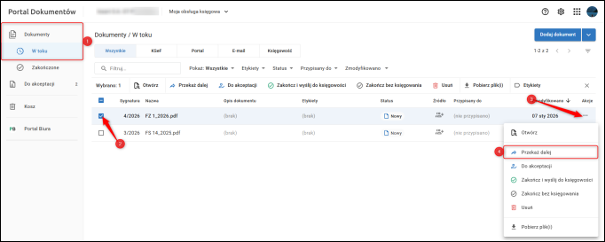 1. Przejść do modułu Dokumenty/W toku, kliknąć menu przy dokumencie i wybrać Przekaż dalej.