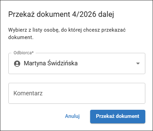 2. Z listy rozwijalnej wybrać Odbiorcę, uzupełnić Komentarz i zatwierdzić przyciskiem Przekaż dokument.