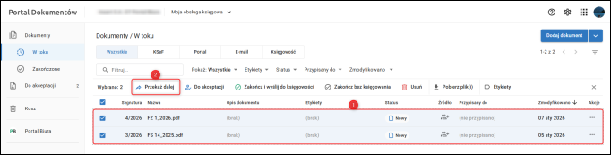 Istnieje możliwość przekazania dokumentów innemu użytkownikowi zbiorczo. Aby to zrobić, należy zaznaczyć kilka dokumentów i kliknąć Przekaż dalej.