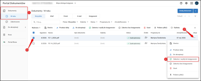 1. W module Dokumenty/W toku kliknąć menu przy wybranym dokumencie i wybrać Zakończ i wyślij do księgowości.
