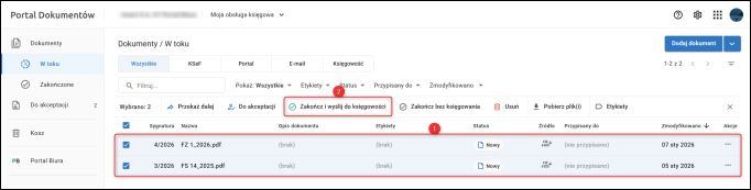 Istnieje możliwość zbiorczej wysyłki dokumentów do programu księgowego. Aby to zrobić, należy zaznaczyć odpowiednie dokumenty i kliknąć Zakończ i wyślij do księgowości.