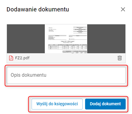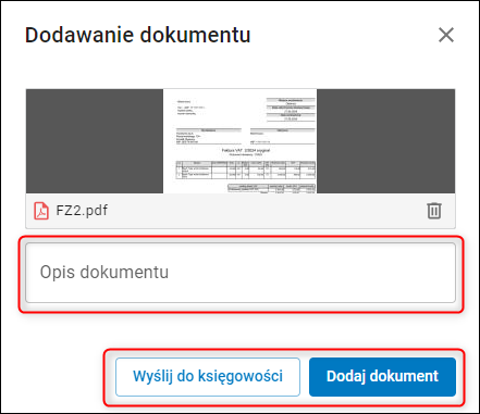3. W oknie przesyłania d​​​okumentu można Dodać dokument do aplikacji lub od razu Wysłać do księgowości.