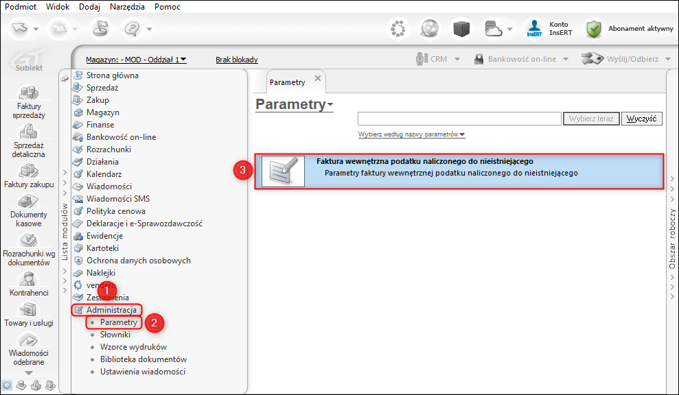 1. Z listy modułów wybrać Administracja – Parametry, a z listy parametrów Faktura wewnętrzna podatku naliczonego do nieistniejącego.