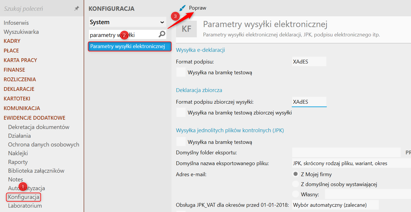 1. Przejść do modułu Ewidencje dodatkowe – Konfiguracja – Parametry wysyłki elektronicznej i z górnego menu wybrać Popraw.
