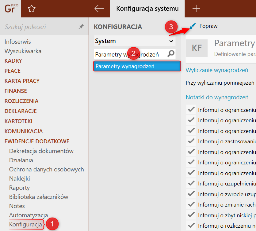 1. Przejść do modułu Ewidencje dodatkowe – Konfiguracja – Parametry wynagrodzeń i z górnego menu wybrać Popraw.