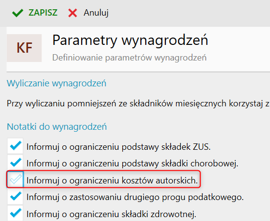 2. Odznaczyć opcję Informuj o ograniczeniu kosztów autorskich i kliknąć Zapisz.