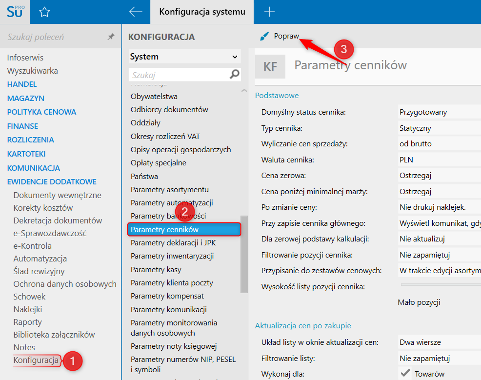 1. Przejść do modułu Konfiguracja – Parametry cennika i kliknąć Popraw.