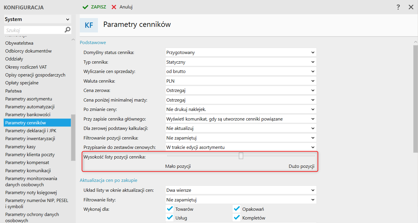 Subiekt nexo – Jak ustawić wysokość listy pozycji cennika?