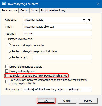 2. W oknie, które się wyświetli zaznaczyć opcję Zezwalaj na edycję PW i RW powiązanych z IWz. Zmiany zapisać przyciskiem OK.