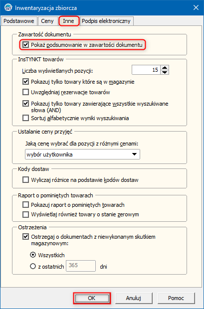 2. W oknie, które się wyświetli przejść na zakładkę Inne i zaznaczyć opcję Pokaż podsumowanie w zawartości dokumentu. Zmiany zapisać przyciskiem OK.