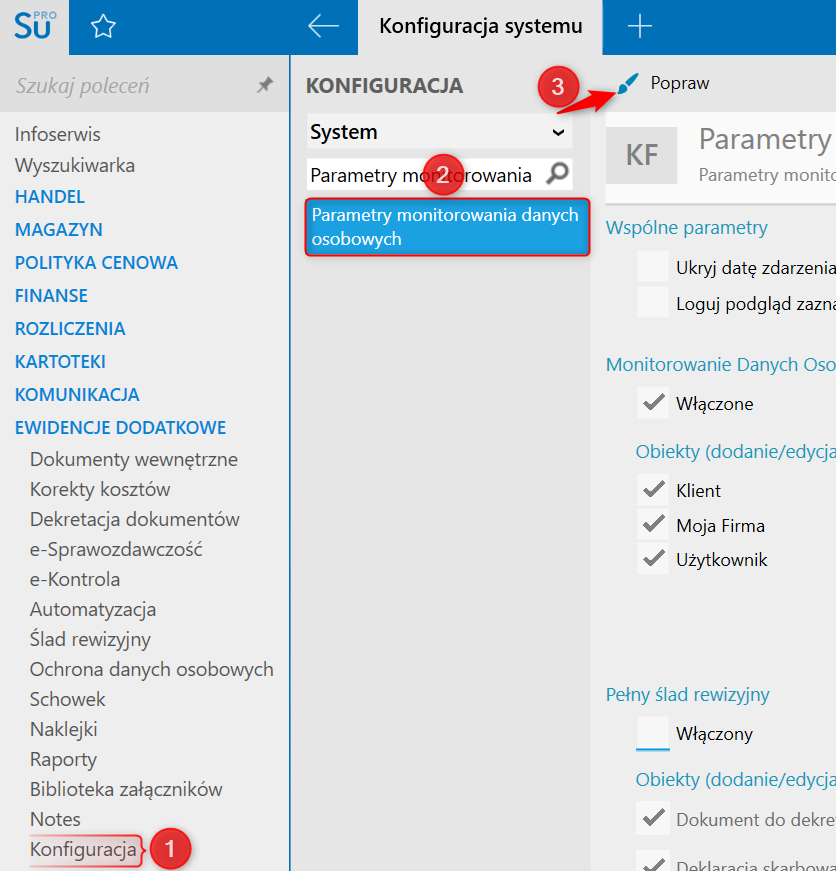 1. Przejść do modułu Ewidencje dodatkowe – Konfiguracja – Parametry monitorowania danych osobowych i z górnego menu wybrać Popraw.