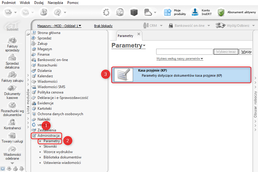 1. Z listy modułów wybrać Administracja – Parametry, a z listy parametrów Kasa przyjmie.