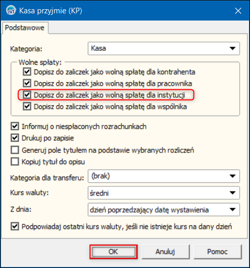 2. W oknie, które się wyświetli zaznaczyć opcję Dopisz do zaliczek jako wolną spłatę dla instytucji. Zmiany zapisać przyciskiem OK.