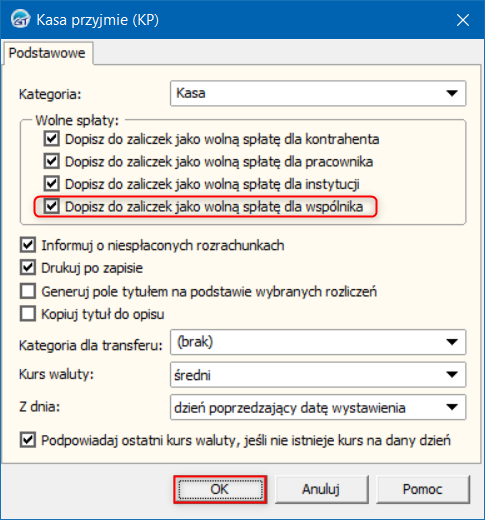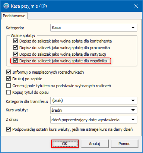 2. W oknie, które się wyświetli zaznaczyć opcję Dopisz do zaliczek jako wolną spłatę dla wspólnika. Zmiany zapisać przyciskiem OK.