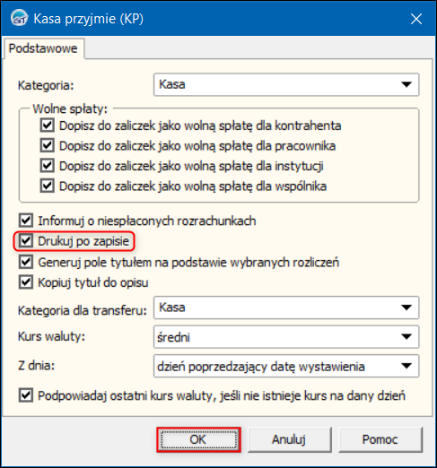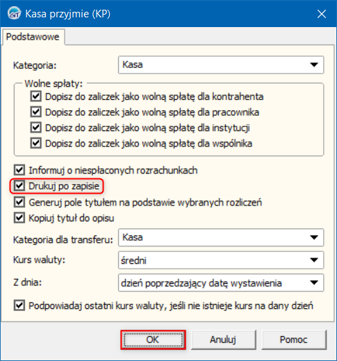 2. W oknie, które się wyświetli zaznaczyć opcję Drukuj po zapisie. Zmiany zapisać przyciskiem OK.