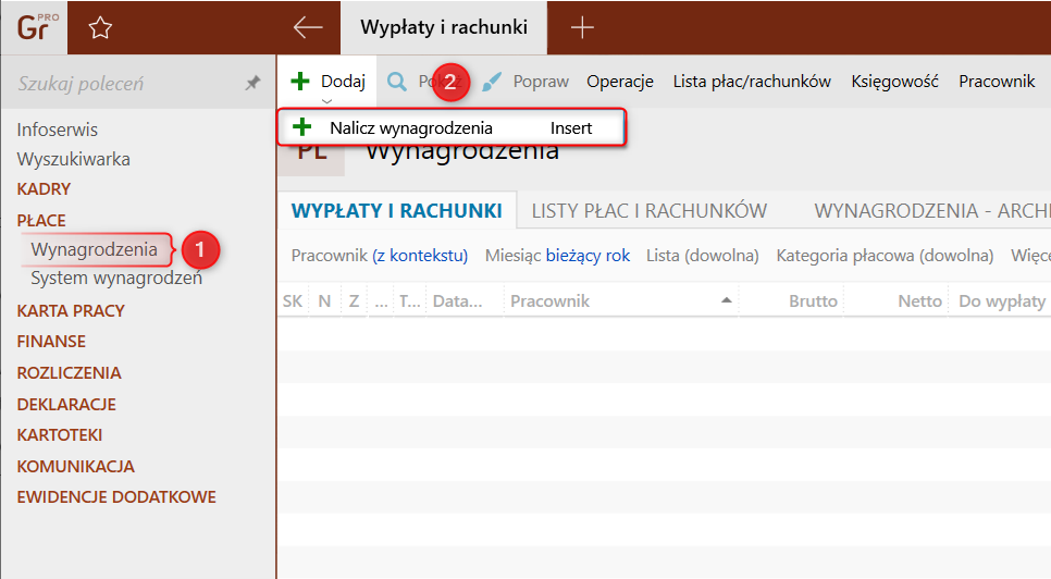 1. Przejść do modułu PłaceWynagrodzenia i z górnego menu wybrać DodajNalicz wynagrodzenia.