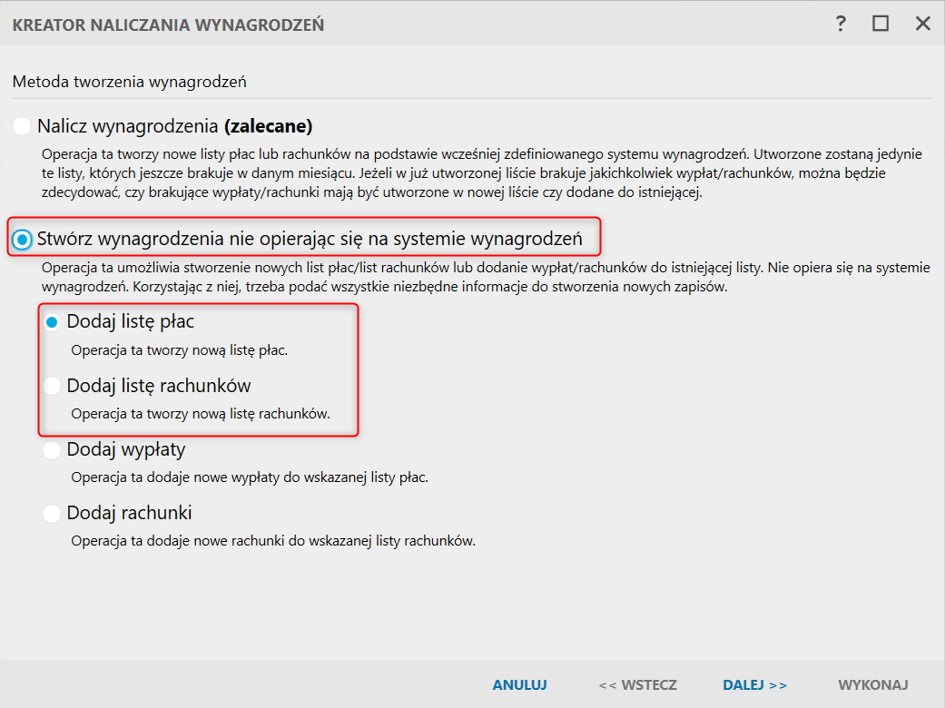 2. Zaznaczyć opcję Stwórz wynagrodzenia nie opierając się na systemie wynagrodzeń, a następnie Dodaj listę płac (lub Dodaj listę rachunków) i kliknąć Dalej.